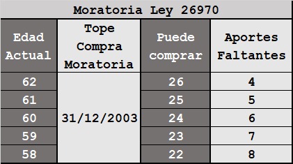 En definitiva, y a modo de ejemplo, podemos decir que si nuestra cliente hubiera nacido en el año 1959, tuviera 3 hijos y no poseyera ningún aporte efectivamente realizado, podría comprar en moratoria por Ley 26970: 26 años, se le computarían 3 años de aportes en relación a sus hijos, y le estaría faltando un año de aportes para poder jubilarse, que lo compensaría con el exceso de edad que posee.